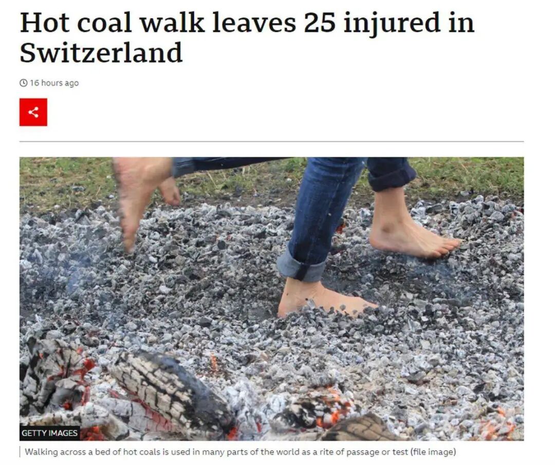 前两天看到一则新闻,瑞士的一家公司举办团建活动,其中有一项是“赤脚走火炭”的项目。25人走完后,被烧伤,其中13人伤势较重,已被送往医院接受治疗。