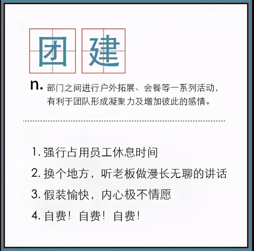 总结一下这些奇葩团建的共性:在员工休息时间苦员工心志、劳员工筋骨,还得员工自掏腰包。