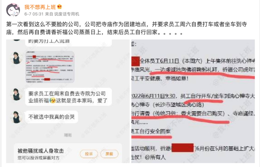 前两天看到一个更可笑的团建活动,让员工们周六自行前往寺庙上香给公司祈福,划重点:交通费和香火费自掏腰包。