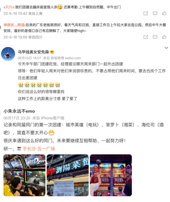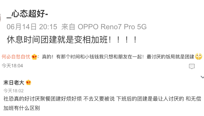 “你觉得公司周末团建算变相加班吗?”登上热搜后,网友们纷纷吐槽自己公司周末/休息日团建的糟心行为。